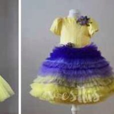Размерный ряд 92-158 Платье с отрезной юбкой, по верху юбки сборки, низ обработан притачной обтачкой. По окату рукава сборки, низ рукава обработан кулиской с эластичной тесьмой, ширина 2см. Горловина платья обработана притачной обтачной. В центральном шве спинки разрез, застежка на 1 пуговицу и