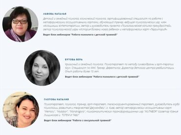 12 вебинаров 36 академических часа Вебинары онлайн+записи+метод. материалы Блок 1. Первичная психологическая помощь в экстремальных ситуациях. Работа с горем. Блок 2. Работа с сексуальной травмой Блок 3. Работа психолога с детской травмой Блок 4. Работа с депрессией, психосоматика Блок 5.
