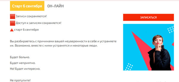 Вы получаете полный курс / тренинг со всеми материалами, но без обратной связи и поддержки автора Наталии Капцовой — именно это позволяет предложить такую выгодную цену. Вы учитесь в удобном ритме, без переплаты за сопровождение.
