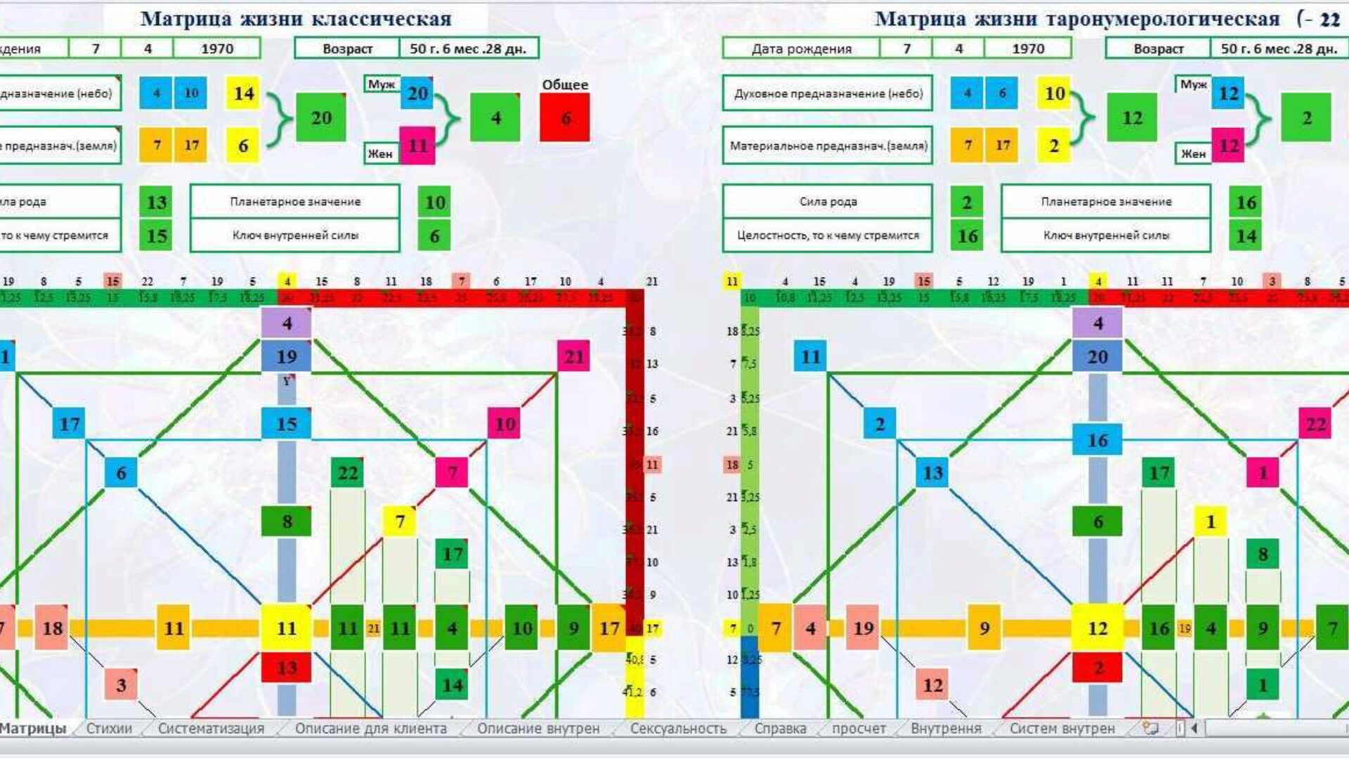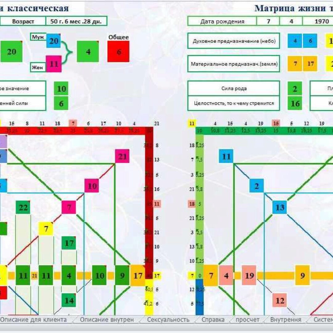 Вы получаете инструмент по расчету и созданию описания матрицы жизни.