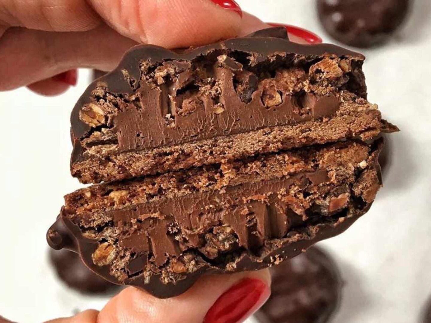 1. Печенье шоколадное, с шоколадным кремом и хрустящим шоколадным слоем с осколками какао-бобов в глазури из чёрного шоколада.