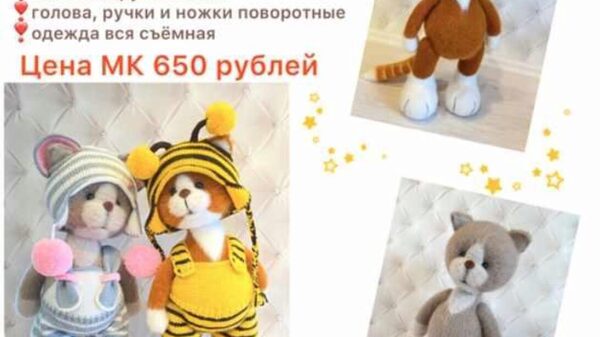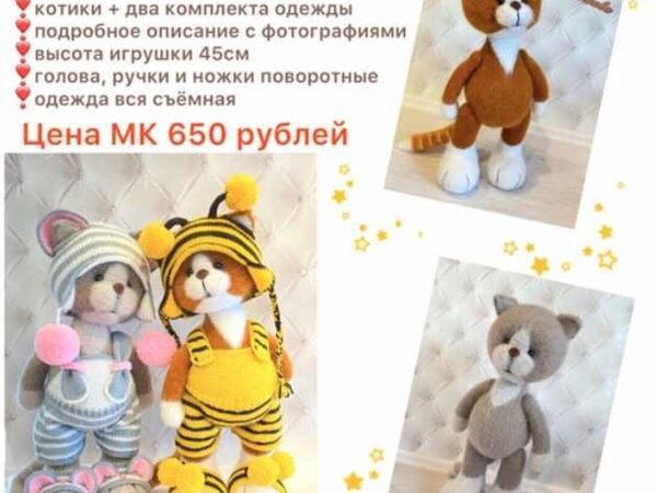 МК котики Крошки находится в закрытой группе. МК состоит из текстового описания процесса вязания игрушки и видео по основным моментам. Видео к МК записаны прикреплены записью экрана с закрытой группы ВК. При использовании указанных материалов, рост игрушки около 23см без учёта ушек. В описании так