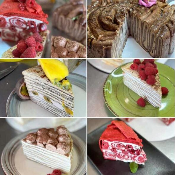 В уроке «Блинные торты»: Блинный торт «Ваниль-Шоколад» со свежими ягодами. Рецепт блинчиков на кипятке, воздушный ванильный крем «Дипломат», взбитый ганаш на молочном шоколаде, сборка торта и стабильная конструкция сборки Блинный торт «Вишня-Маскарпоне». Рецепт блинчиков на кипятке, сливочный крем