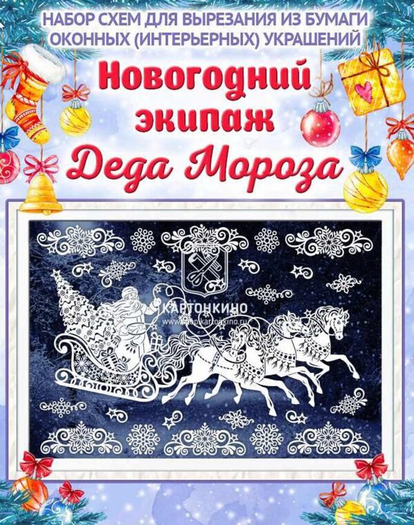 1. Компактный масштаб (для оконных секций шириной от 45 см): Дед Мороз и Снегурочка: 43,1×79,1 см; мешок с подарками: 38,3×41,9 см; игрушки: 43,4×36,2 см; колокольчики (верхний декор): 43,4×21,8 см; надпись «С Новым годом!»: 36,0×15,0 см; надпись «С новым счастьем!»: 40,8×12,0 см. 2. Базовый