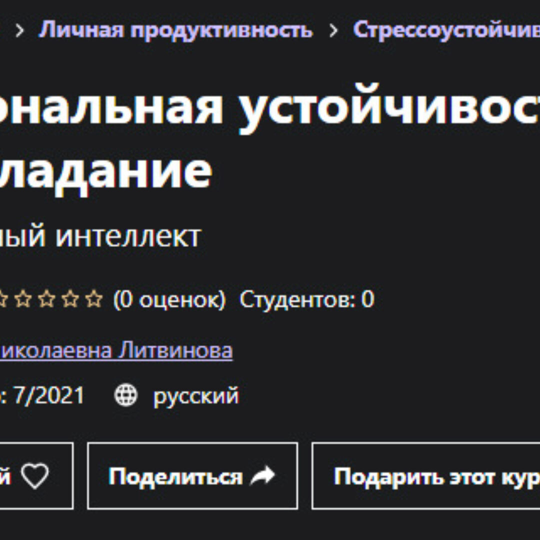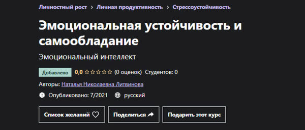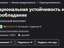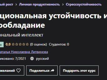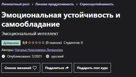 Курс Udemy - Эмоциональная устойчивость и самообладание, автор Наталья Литвинова. От эмоциональной устойчивости зависит во многом наша самооценка, устойчивость к стрессам, здоровье, качество взаимоотношений, исходя из нашего эмоционального состояния мы часто осуществляем наши выборы и принимаем решения.