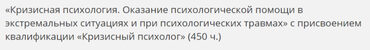 12 вебинаров 36 академических часа Вебинары онлайн+записи+метод. материалы Блок 1. Первичная психологическая помощь в экстремальных ситуациях. Работа с горем. Блок 2. Работа с сексуальной травмой Блок 3. Работа психолога с детской травмой Блок 4. Работа с депрессией, психосоматика Блок 5.