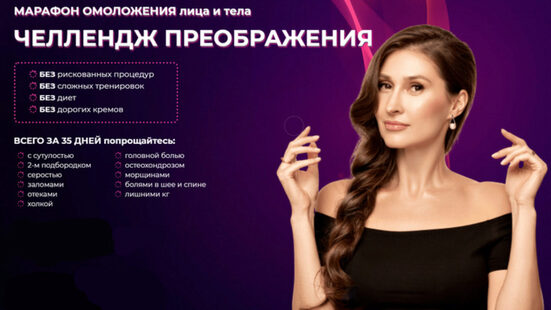 Самый эффективный онлайн — проект по естественному омоложению для женщин! Получите систему омоложения и За 35 дней «ПРОКАЧАЙТЕ» вашу красоту и здоровье без рискованных процедур! Как будет достигнут эффект Омоложения? Специальный комплекс упражнений, который включает в себя комплексную работу над