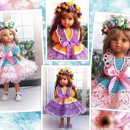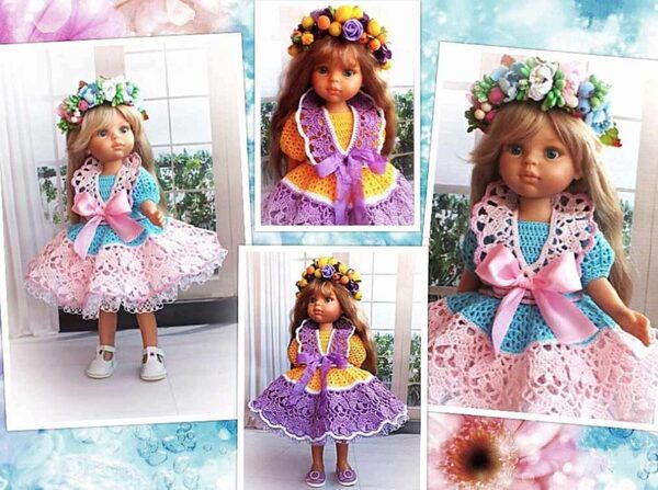 PDF-журнал по вязанию крючком наряда «Лиза» для кукол типа Paola Reina 34см Модель разработана для паолочек на новом типе тела. На телах предыдущих выпусков платье сидит чуть свободнее. ► Подробное текстовое описание вязания каждого ряда палатья и шляпки (с цветным узором) ► Фотографии этапов