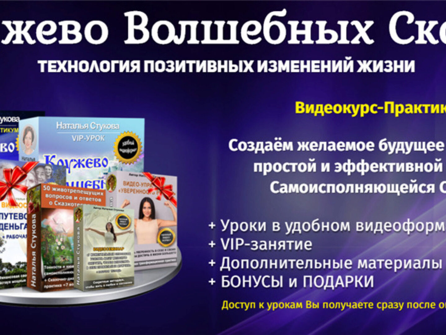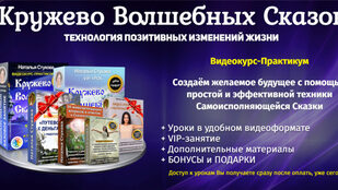 - Урок 8. ФУНДАМЕНТАЛЬНЫЙ УРОК, в ходе которого у Вас появится своя Самоисполняющаяся Сказка. Вы прочувствуете таинство создания сказки. И создадите лично свою. Ту, что имеет все шансы на реализацию в ближайшие недели