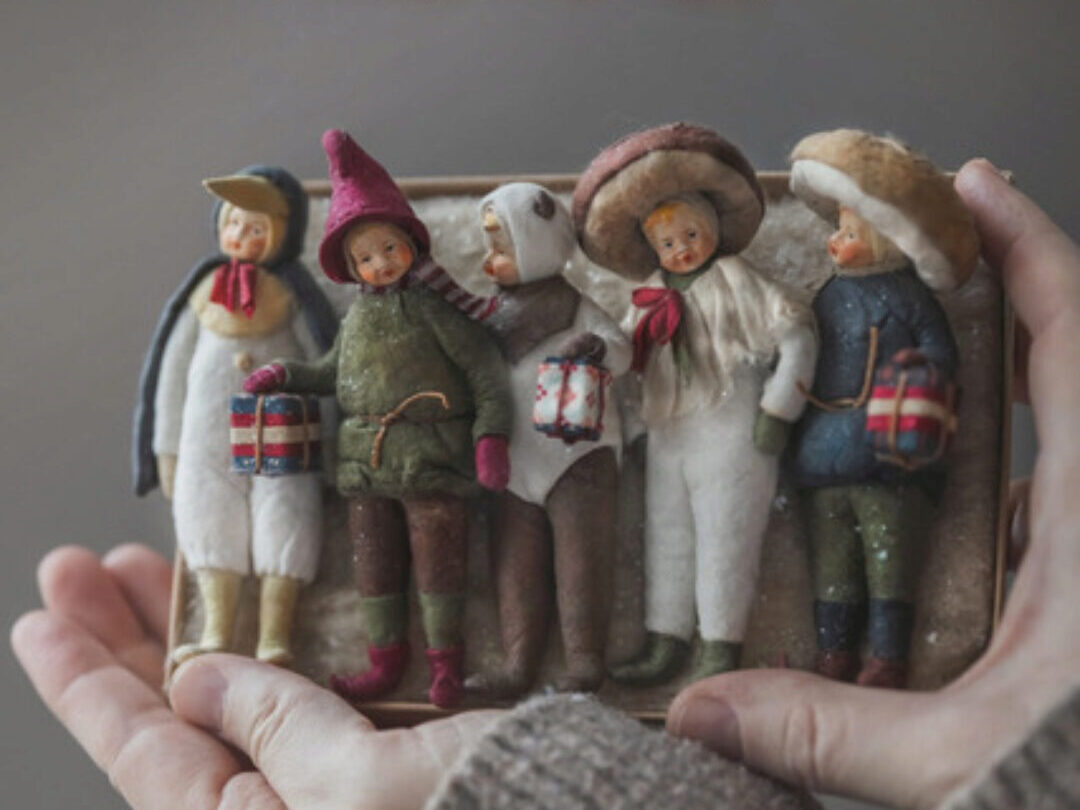 Окрашивание ваты (краситель прибой или джинса) и тонирование ваты. Создание личика из самозатвердевающей пасты с помощью самодельного молда. Роспись личика масляными красками.