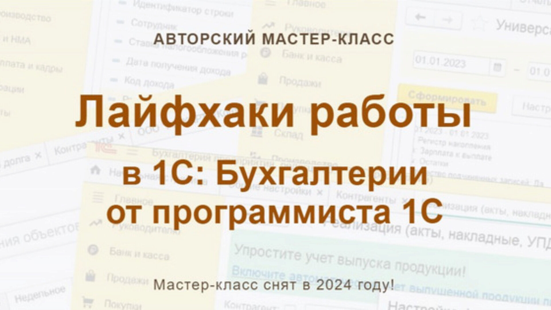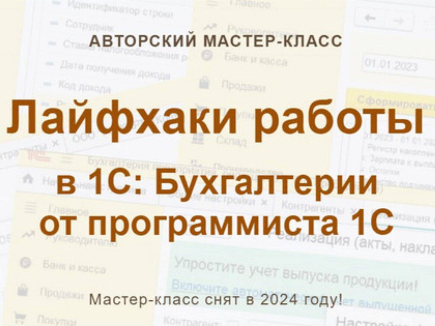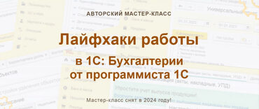 Что представляет собой мастер-класс: 4 видеоурока общей продолжительностью 2,5 часа 3 бонусных видео из закрытого клуба бухгалтеров (еще 2 часа) Начало обучения в любое удобное время Бессрочный доступ к видео сразу же после оплаты Что интересного обсудим на мастер-классе: самые важные настройки