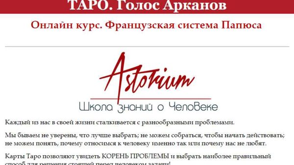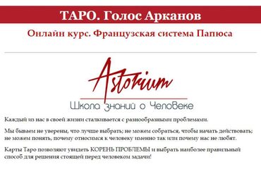 Дата начала и продолжительность 25 и 26 января 2020 г. с 10:00 до 18:00. Этот курс впервые читается в Институте эзотерики«Альвасар». Он включает в себя глубокую проработку старших арканов Таро с точки зрения нумерологии здоровья, бизнеса, судьбы и кармы. После этого курса вы легко сможете