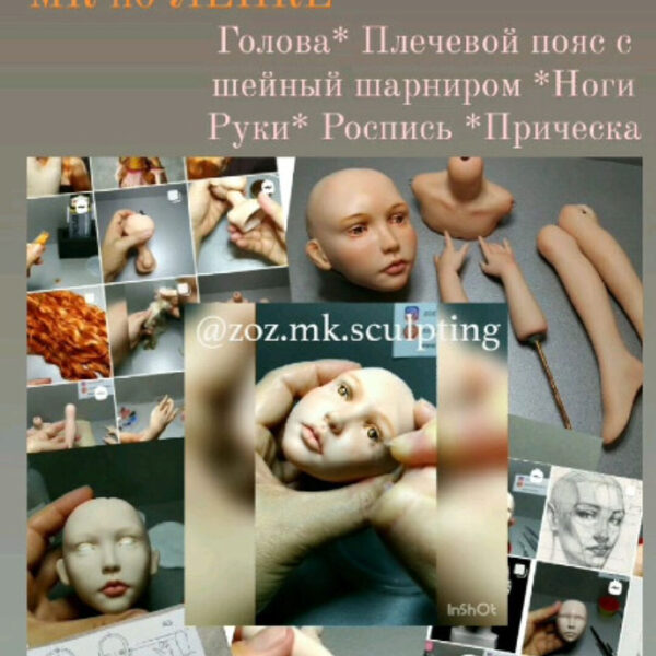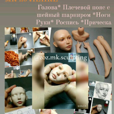 туда входит Лепка лица*рук* плечевого пояса (шея на шарнире)* ног до колена (соединение отличается от соединения ног в МК по подвижному телу)* Роспись маслом и пастелью