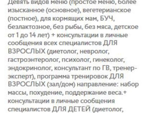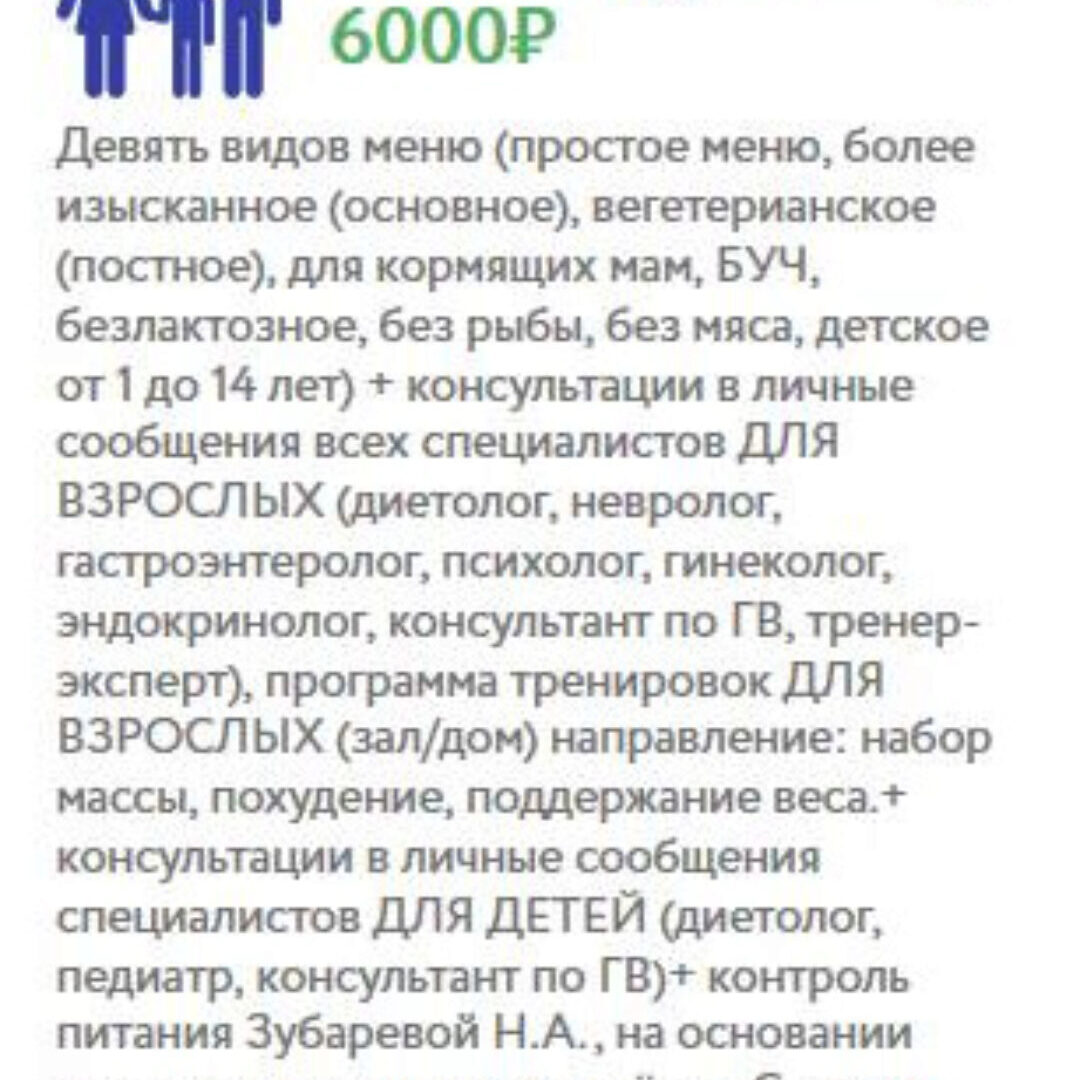 УНИКАЛЬНАЯ СИСТЕМА ПИТАНИЯ ОТ НАТАЛЬИ ЗУБАРЕВОЙ - онлайн - школа Натальи Зубаревой Тариф «Семейный» включает в себя: 9 видов меню (простое, более изысканное, вегетарианское, для кормящих мам, БУЧ, безлактозное, без рыбы, без мяса, детское от 1 до 14 лет). Программа тренировок для взрослых (зал/дом)