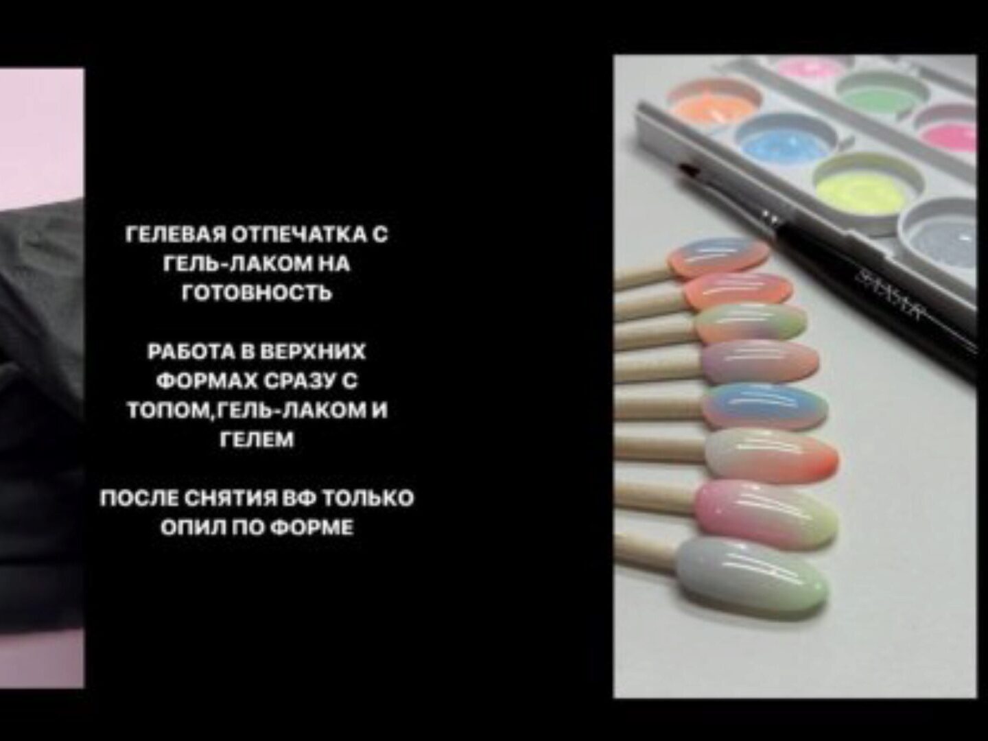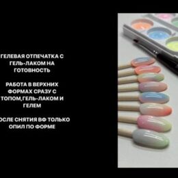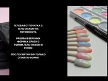3. блок «Гелевая отпечатка с гель лаком»-техника, которая позволяет нанести в верхнюю форму СРАЗУ топ, цвет и гель , а после снятия ВФ просто опилить форму свободного края и…. ВСЕ. Так же эта техника позволяет нам делать заготовки заранее, если мы знаем номера форм, подходящих нашим клиентам, а это значит, что с заготовками время работы с клиентом уменьшается минимум в 2 раза. Потому что вам останется только выполнить маникюр и поставить заготовки с помощью капли Геля на ногтевую пластину