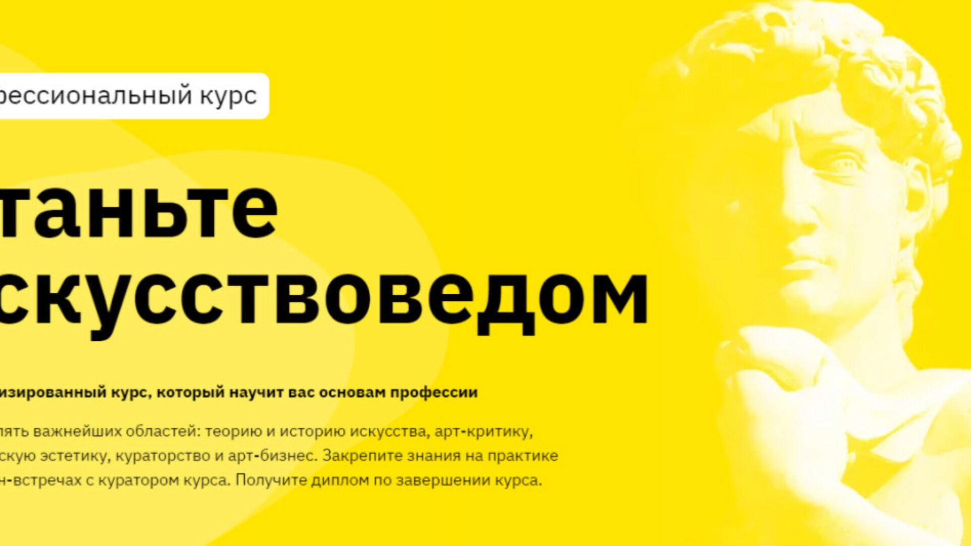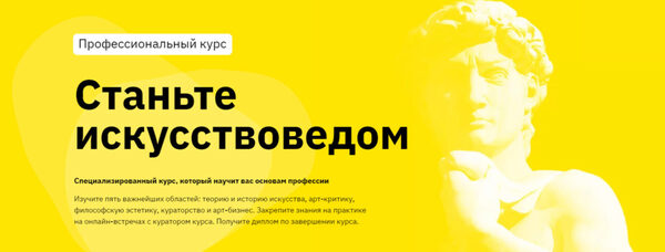 Изучите 5 важнейшних областей: теорию и историю искусства, арт-критику, философскую эстетику, кураторство и арт-бизнес Вы получите: материалы cпециализированного курса, который научит вас основам профессии (доступ к видео-лекциям и дополнительным материалам) Для кого курс: Тех, кто хочет стать