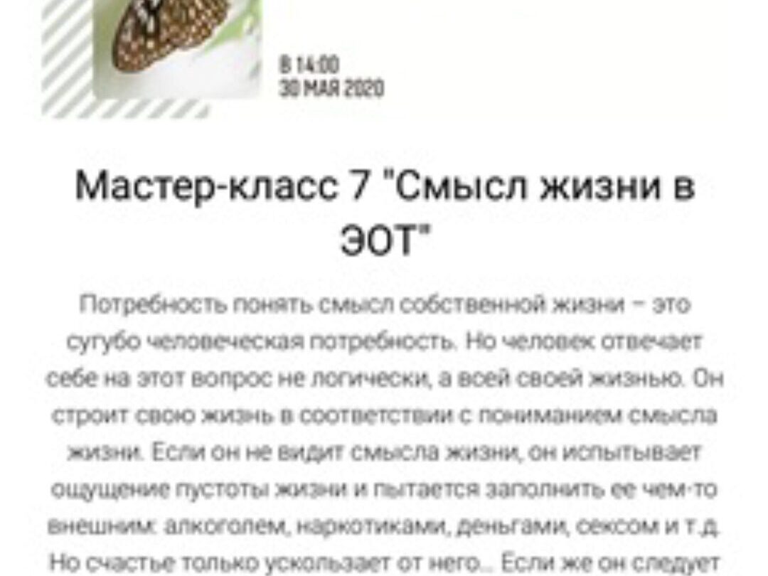 Философия ЭОТ: третья ступень обучения эмоционально-образной терапии Программа курса 1) Предназначение и жизненный путь 2) Долг и стремление 3) Процесс и результат 4) Принцип непривязанности 5) Любовь и власть 6) Ревность и зависть 7) Стыд и достоинство 8) Судьба и характер 9) Смысл жизни (старт 21