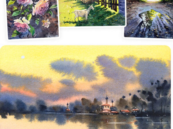 - Нарисуете 3 акварельные картины с восхитительными летними сюжетами - пейзаж в парке Коломенское с красивой освещенной поляной и живописной лужей, деревенский пейзаж с козочкой и красивыми тенями, прекрасный сюжет с розой в контрастном освещении;