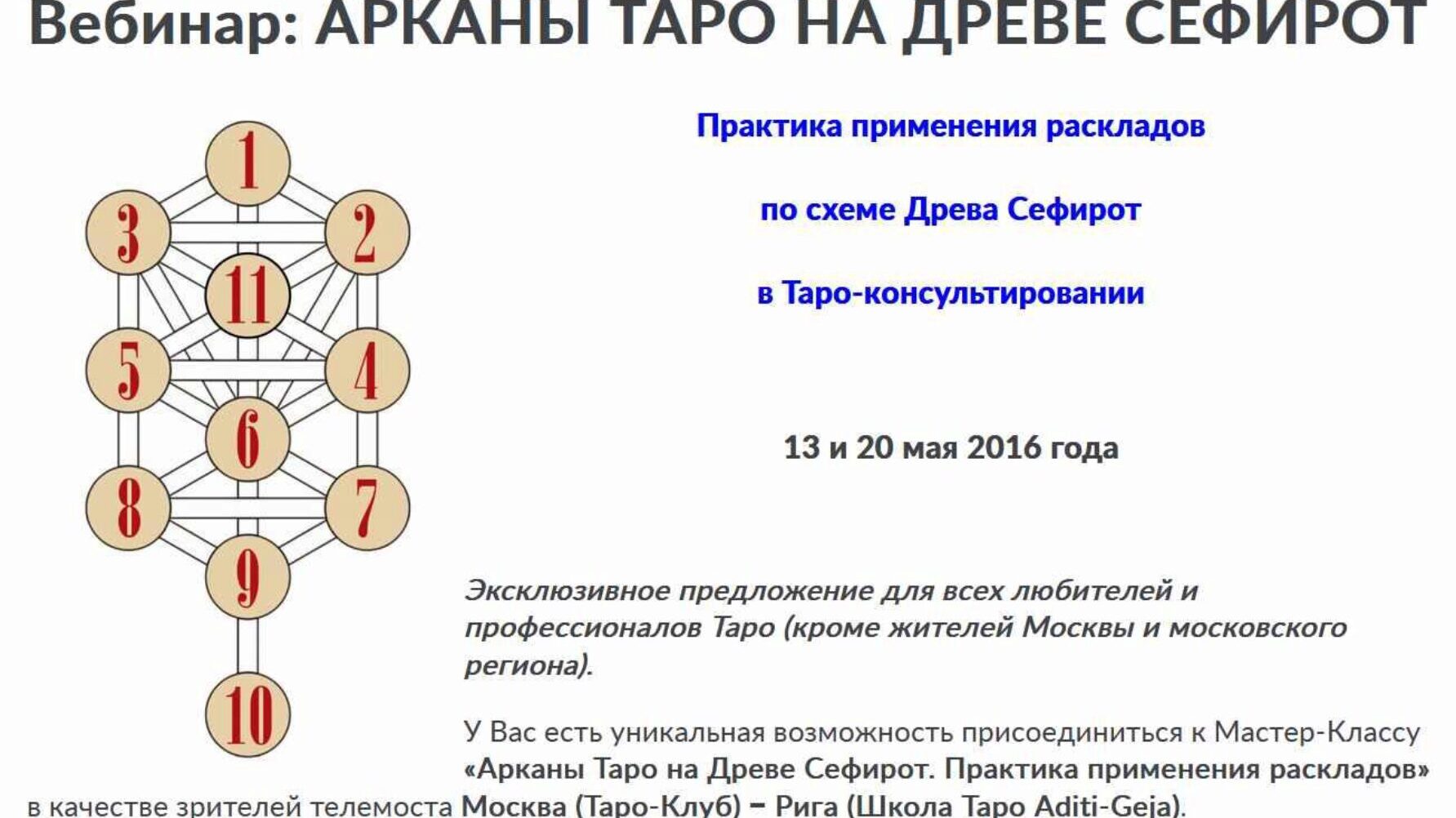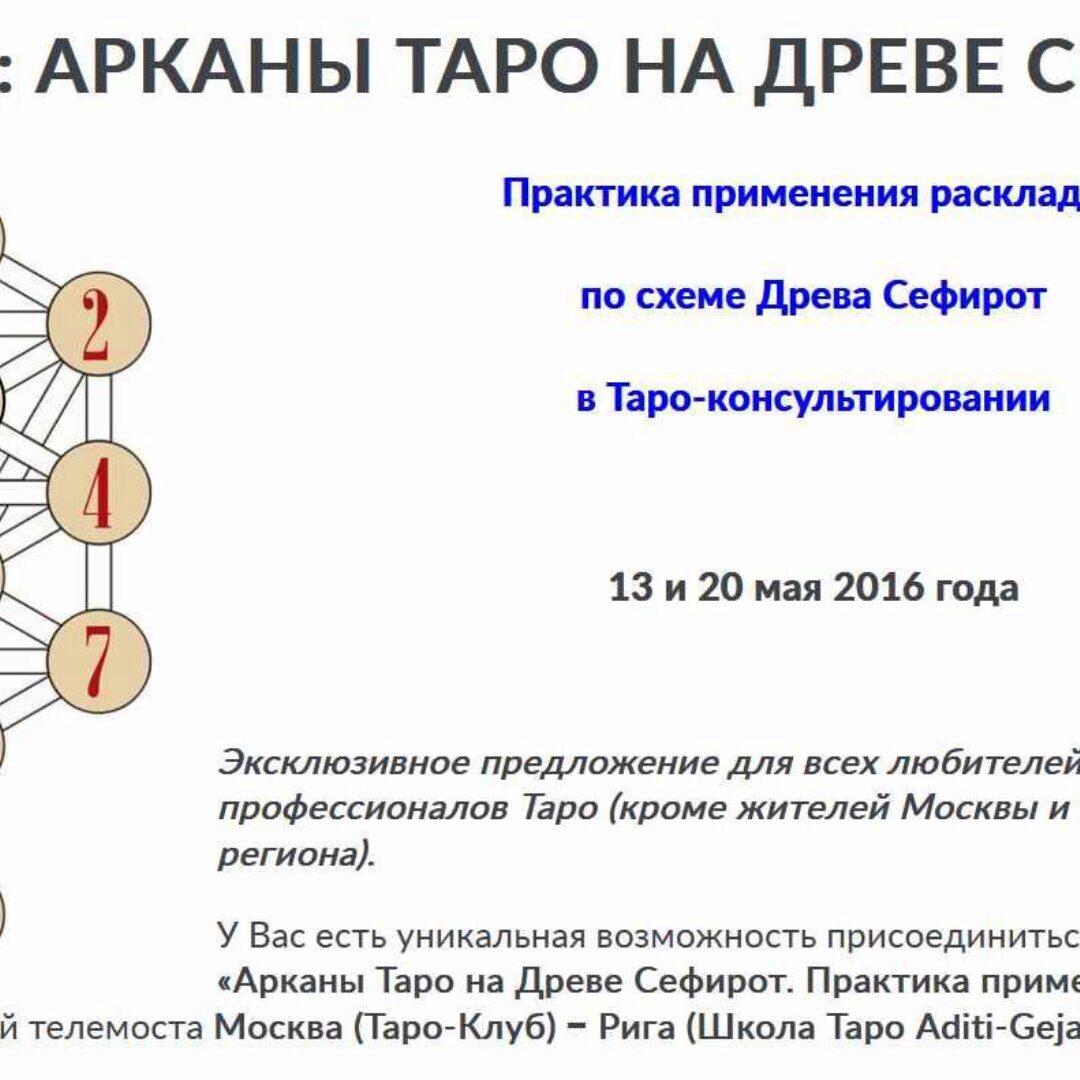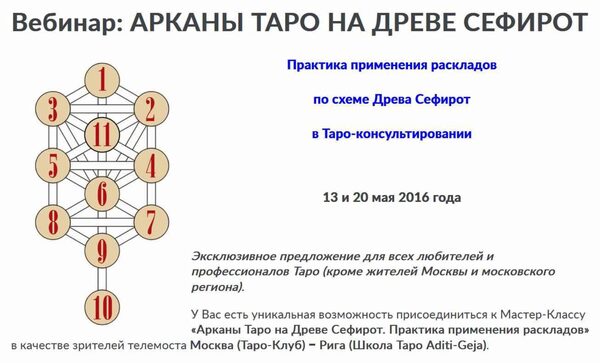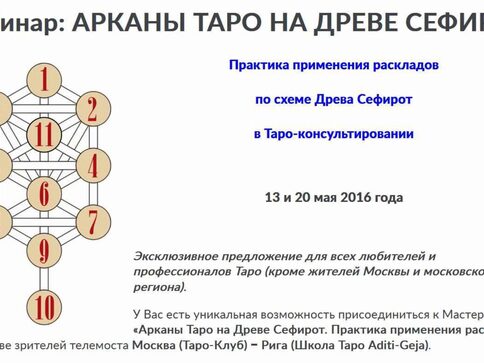 На семинаре будет подробно разобран расклад «Древо Сефирот» и его приложения к конкретным ситуациям. Само Древо Сефирот в его каббалистическом смысле мы рассмотрим только в общем виде, настолько, насколько это нужно для понимания схемы расклада.