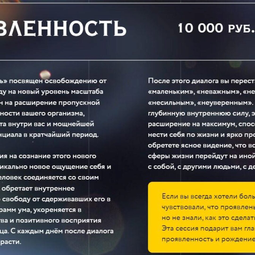 Эта сессия посвящена избавлению от страхов, тревог и внутренней скованности, для того чтобы совершить прорыв во всех сферах жизни. Ведь страхи — это главное, что мешает нам проявить свой потенциал на максимум. 30 минут сессии направлены на передачу не столько информации, сколько Энергетического