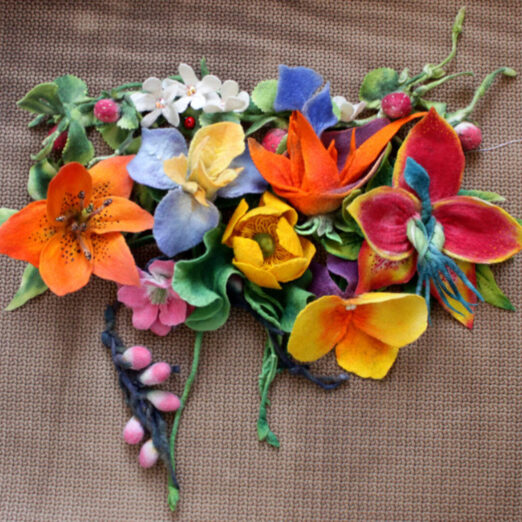 Авторская техника Оксаны Калининой «Оригами из шерсти» позволяет создавать сложные 3D-объекты, используя лишь складывание, завязывание и разрезание слоев. Объект получается цельный, не сшитый из разрозненных элементов, даже самые мелкие детали.