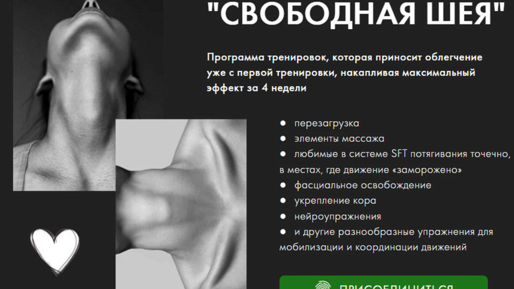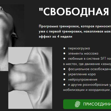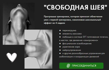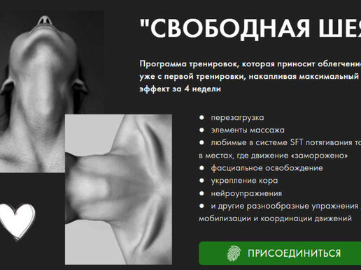 Свободная шея Выполняйте бережные тренировки прямо сейчас и забудьте о головных болях и напряжении в шее уже через 7 дней В программу интенсива входят несложные упражнения, которые вы сможете выполнять в любом месте: Ежедневная гимнастика(10 минут) Расслабление шеи (самомассаж) (30 минут) Раскрытие