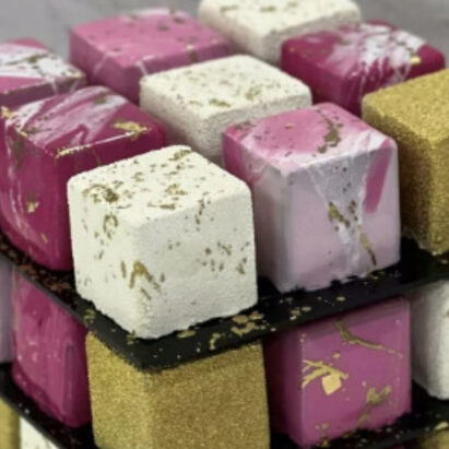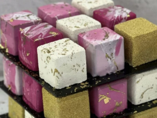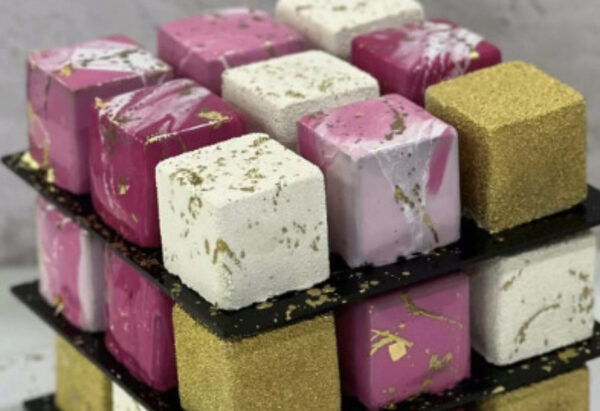 На марафоне Муссовый торт «Кубик»: изготовим 25 кубических пирожных и соберем в торт; научимся делать 2 вида основ, 2 вида муссов и 2 вида прослоек; освоим два вида покрытия: гляссаж и шоколадный велюр; изучим технику покрытия «Леопард»; научимся работать с краскопультом; узнаем, как стабильно собирать сложные конструкции и поговорим о хранении муссовых изделий.