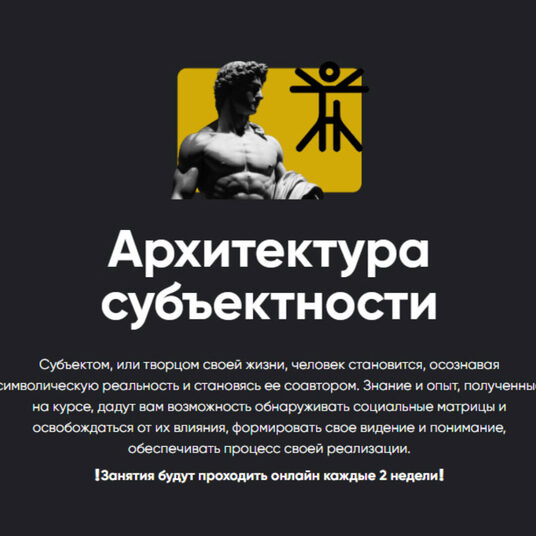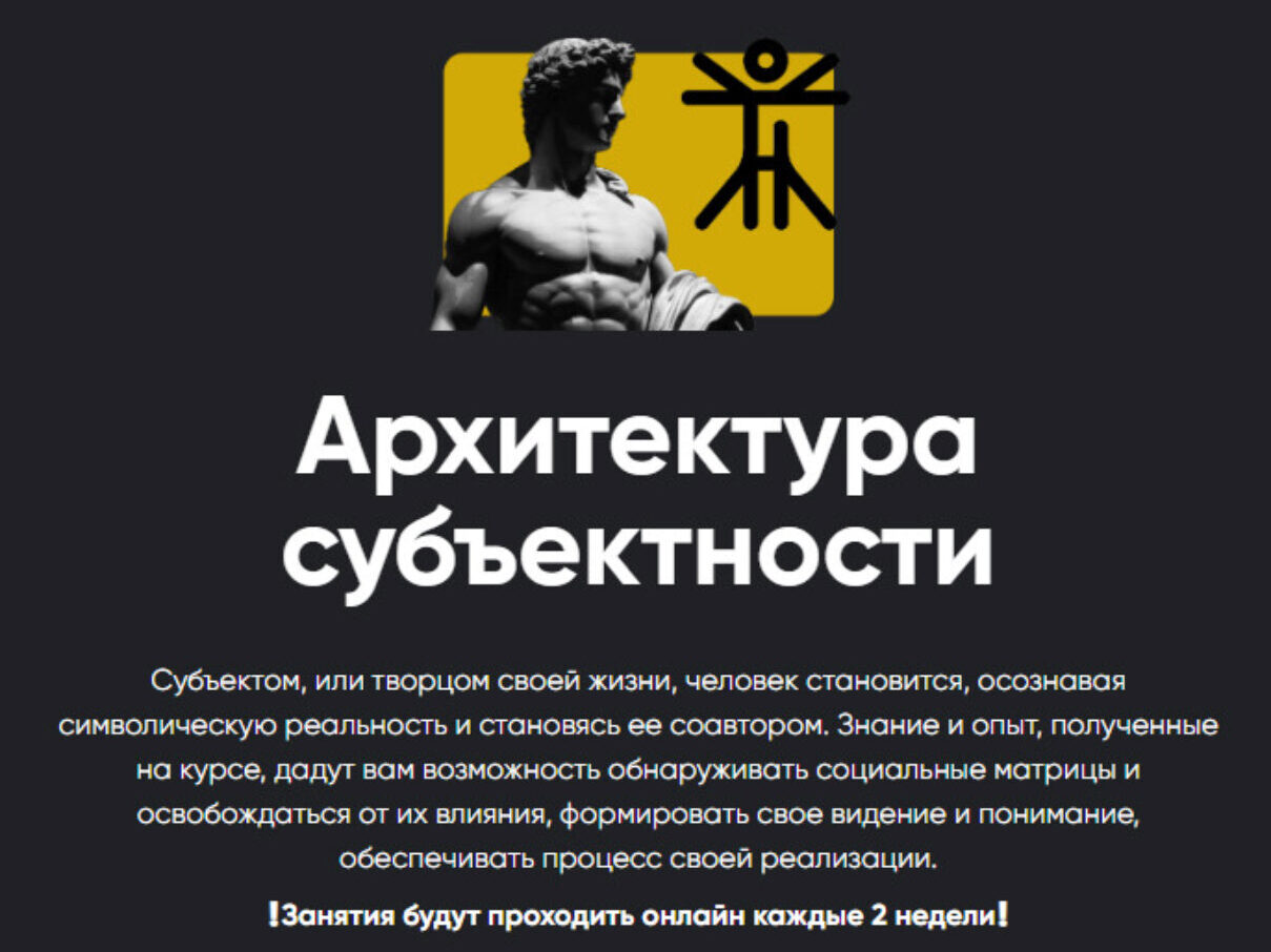 Архитектура субъектности Субъектом, или творцом своей жизни, человек становится, осознавая символическую реальность и становясь ее соавтором. Знание и опыт, полученные на курсе, дадут вам возможность обнаруживать социальные матрицы и освобождаться от их влияния, формировать свое видение и