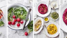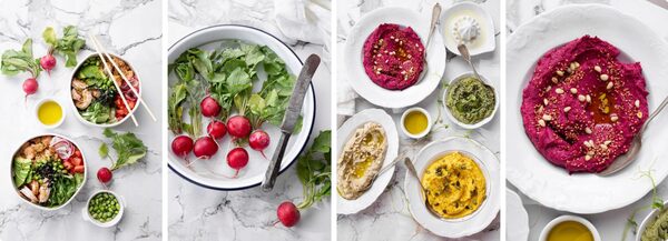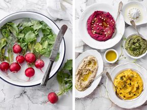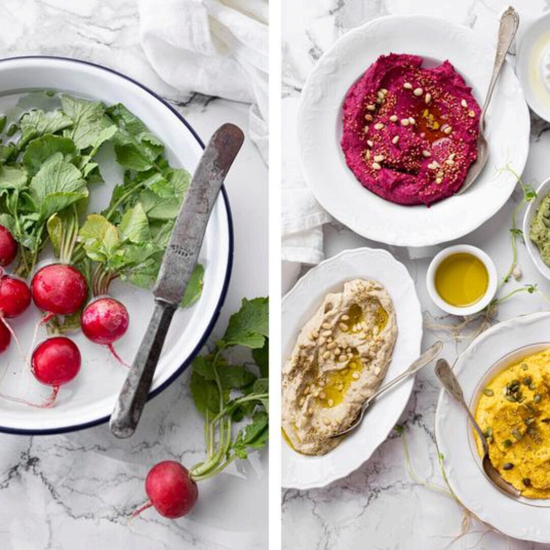 Базовый рецепт, зеленый хумус, баклажановый, тыквенный и свекольный хумус.