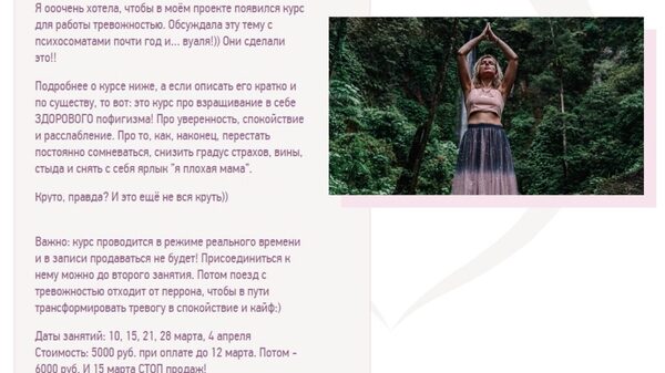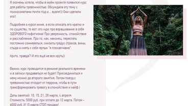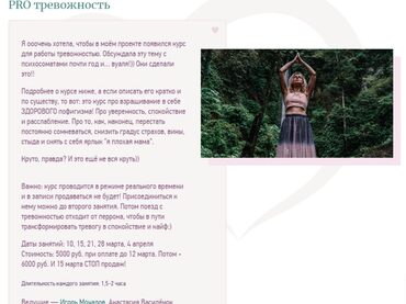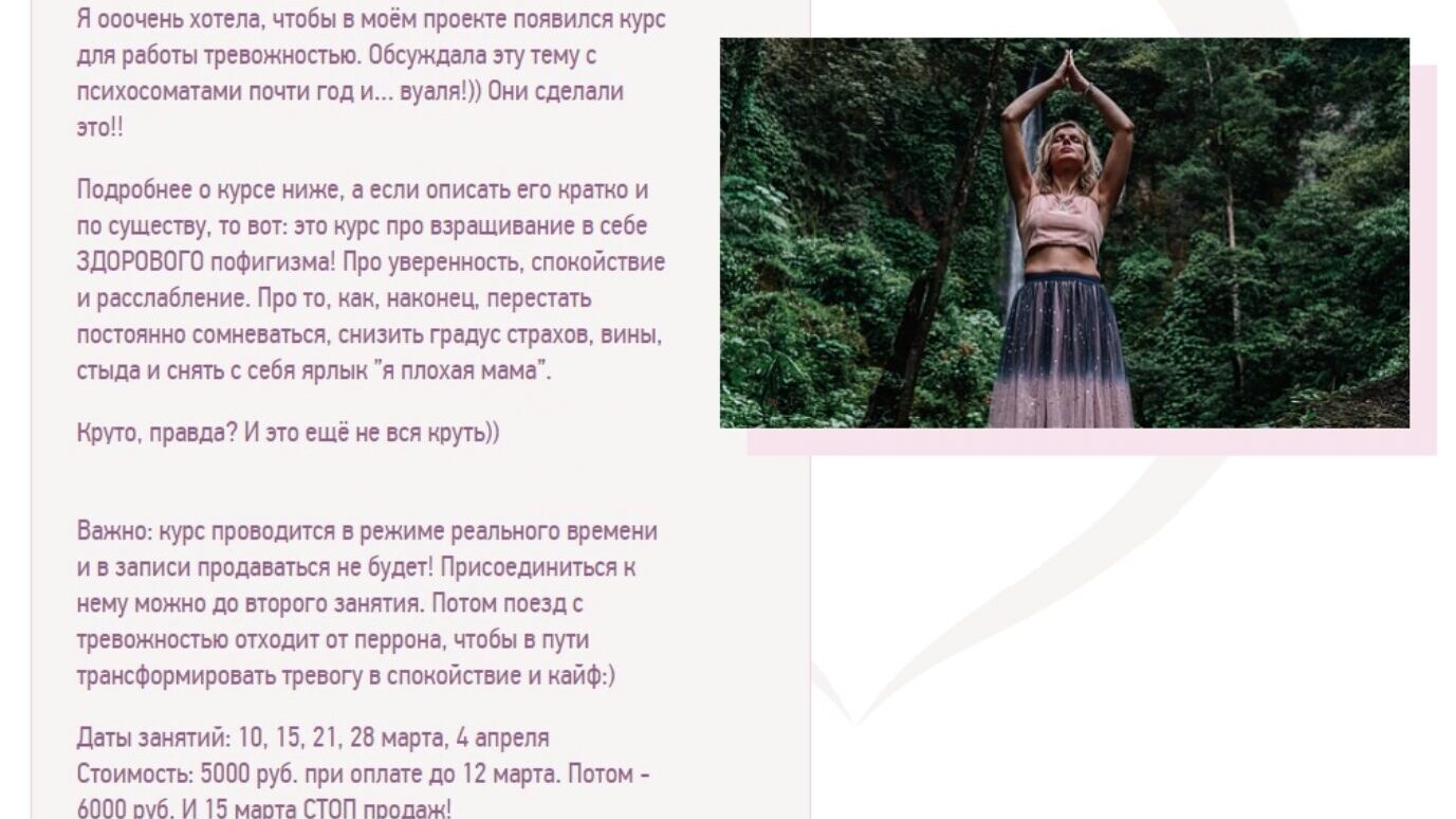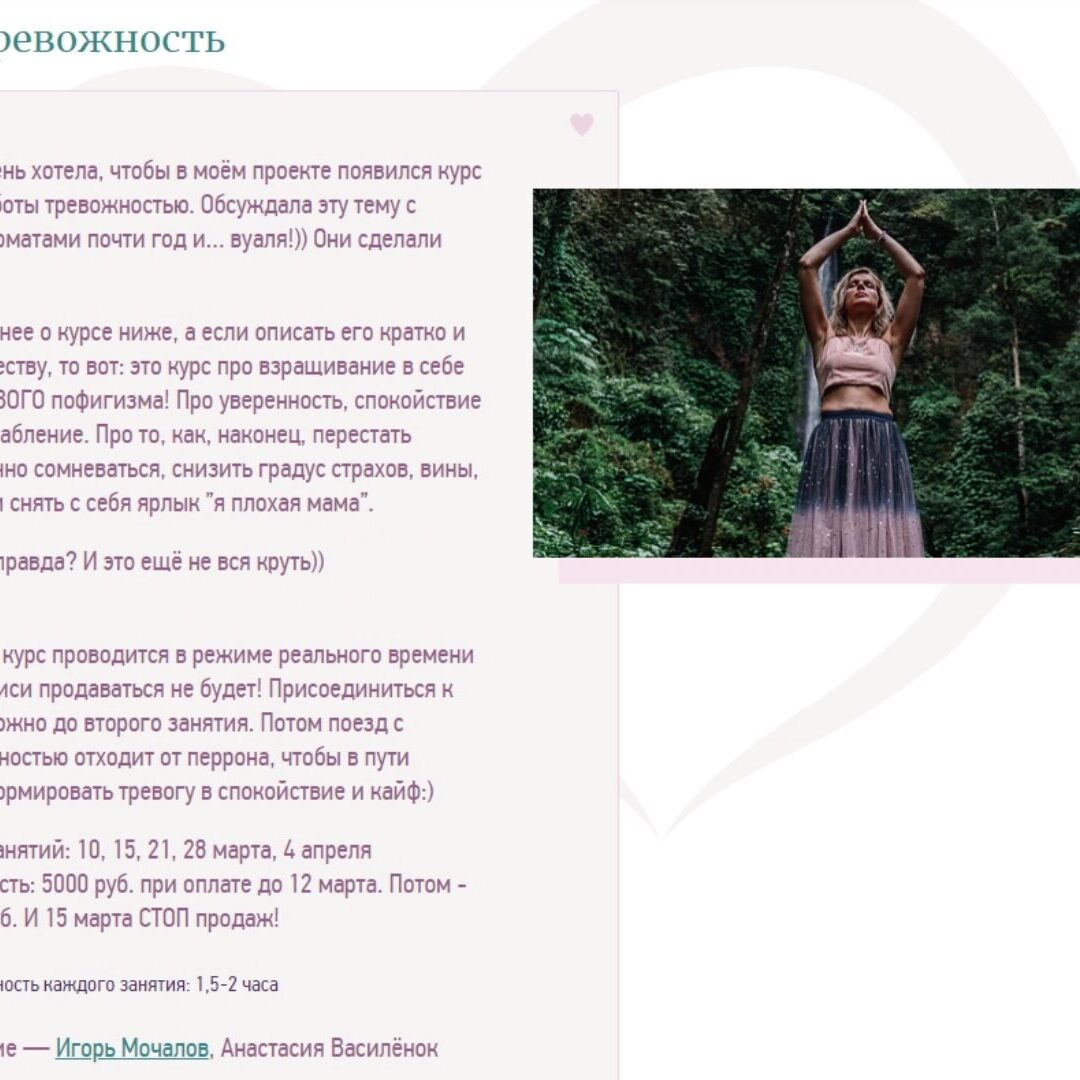 Изначально мы его планировали как курс для проработки именно материнской тревожности, ибо я вижу и знаю, как эта самая тревожность мешает многим женщинам проявлять свой материнский потенциал и кайфовать от материнства. Но в итоге курс получился намного шире, и подходит для проработки ЛЮБОГО вида тревожности, будь она про детей, про здоровье, про еду, про отношения, про работу…. Курс подойдёт, без преувеличения, ВСЕМ, потому что главным является не объект Вашей тревоги, а сам факт её наличия.