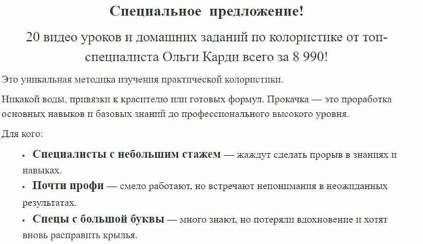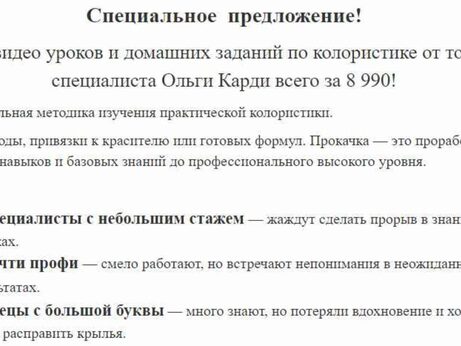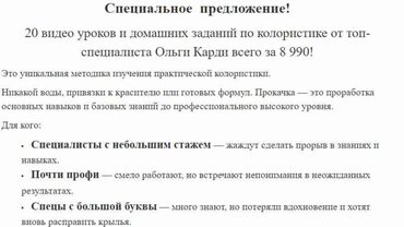 32 часа идей, инсайтов и лайфхаков — это не расскажет тебе даже подруга Ты можешь пройти обучение из любого уголка мира и получить уникальные знания по колористике После курсов твоя жизнь изменится, а доходы вырастут в 3 раза Заряд энергии, вдохновения и сил — лучшие методики и опыт из каждого