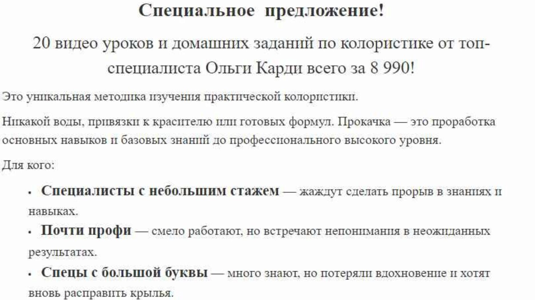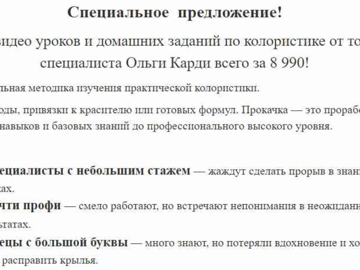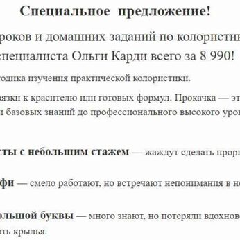 Курс идеально подойдет, если ты: Получаешь не тот оттенок после окрашивания и не понимаешь, в чем проблема, хотя все делала правильно Хочешь иметь сильное окружение единомышленников, которые всегда смогут помочь Выгорела и не получаешь никакого кайфа от работы. Ощущение рутины и непонимания, куда