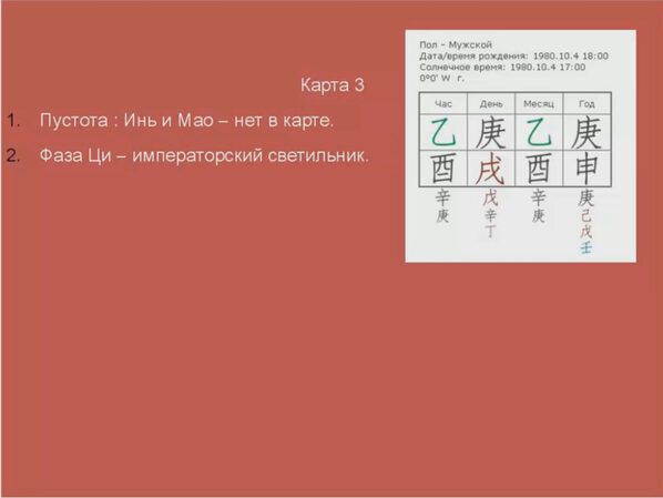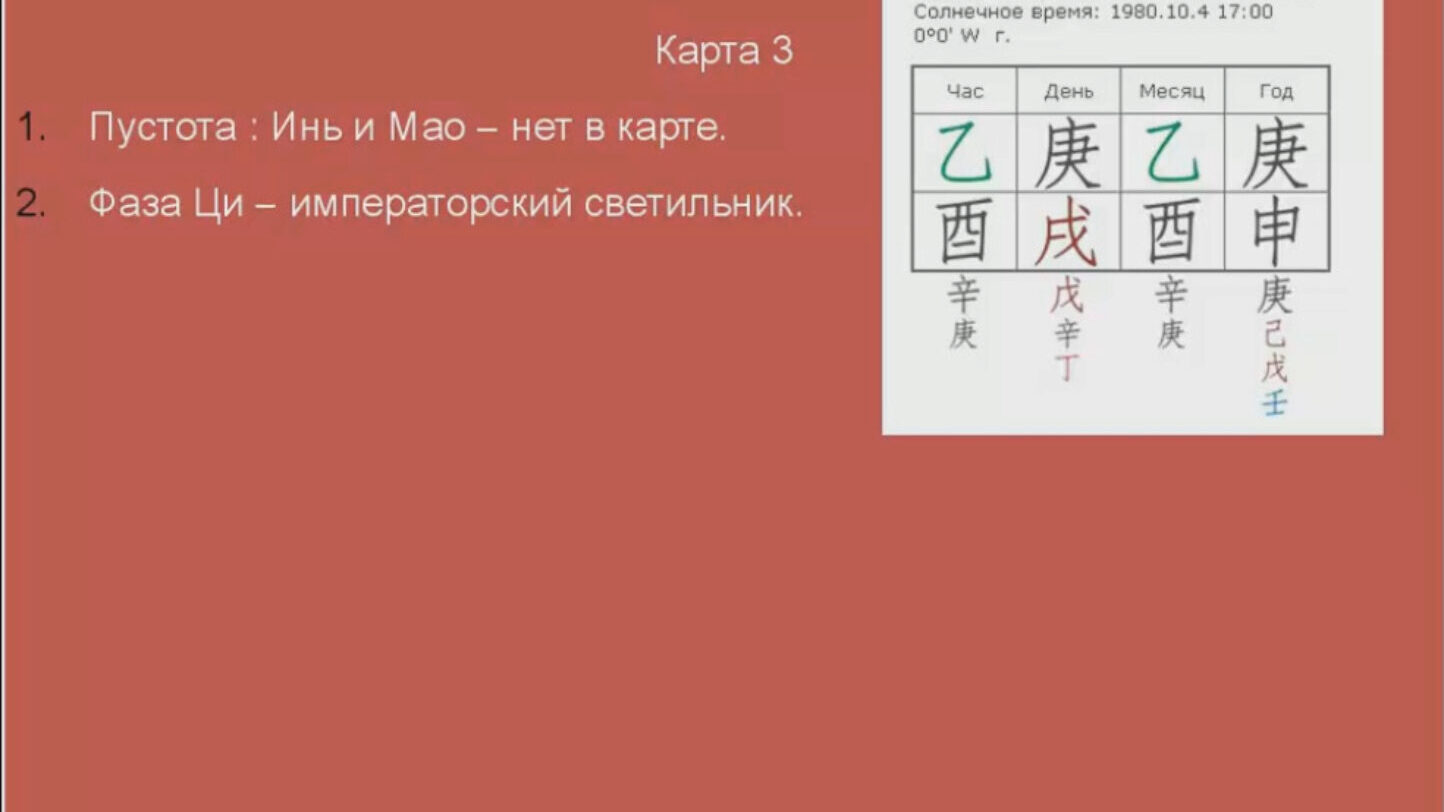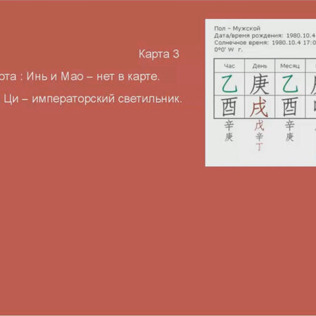 Курс 1 расчитан на тех, кто уже имеет багаж знаний в Ба-цзы, но не умеет или не уверен в том как эти знания применить на практике. Освоение данного курса позволит достаточно масштабно проводить анализ любой карты. В нем вы найдете подробную информацию о таких понятиях как: Слияние и Столкновения,