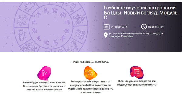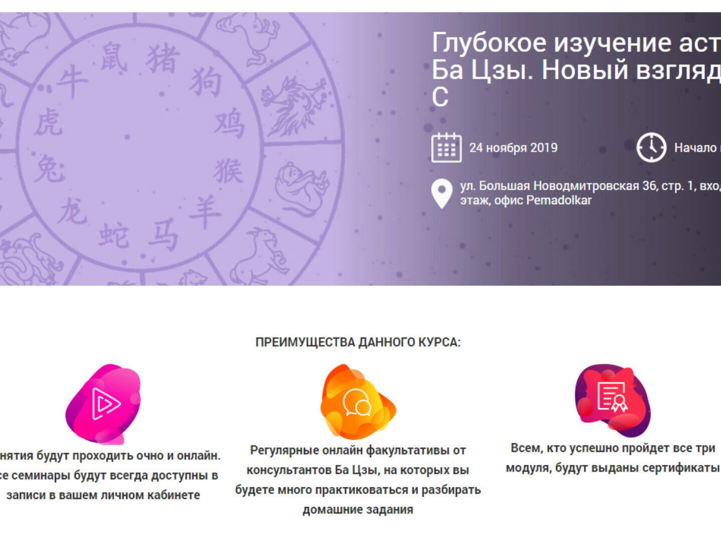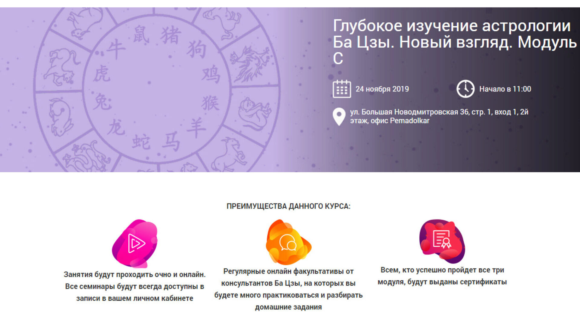 Это глубокий и полный курс для тех, кто хочет изучить Ба Цзы как для личного использования, так и профессионального консультирования. Вас ждут интенсивные занятия с Ольгой Николаевой. Вы будете обучаться по технике мировых классических школ китайской астрологии, которые мало кому доступны. Курс подойдет как для абсолютных новичков, так и для тех, кто ранее уже проходил курсы по Ба Цзы. Это будут совершенно новые знания, поражающие своей точностью.