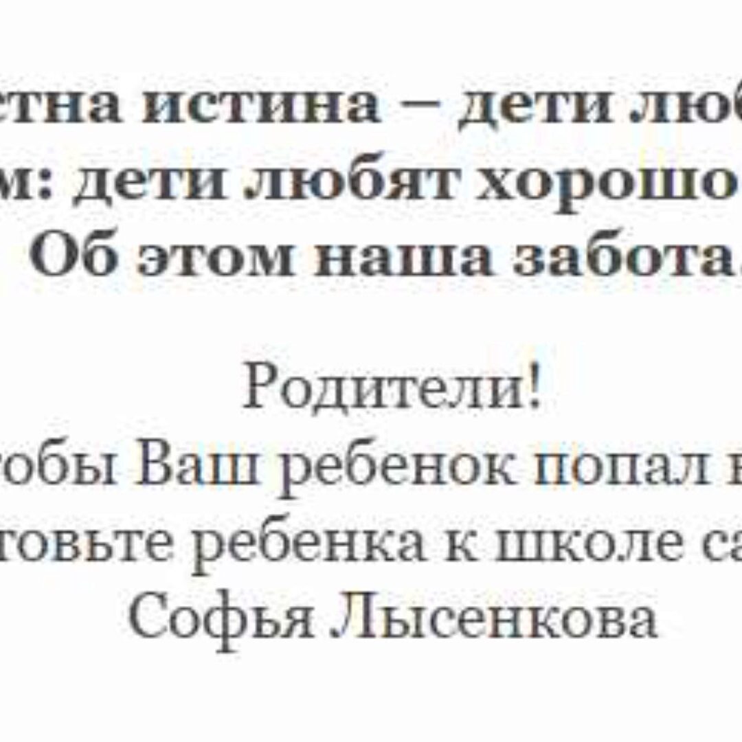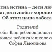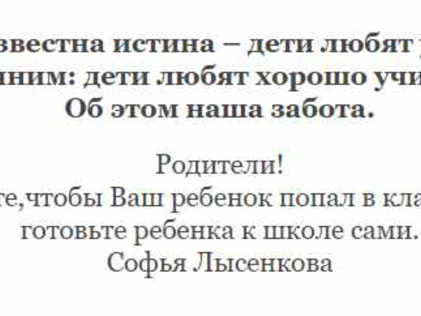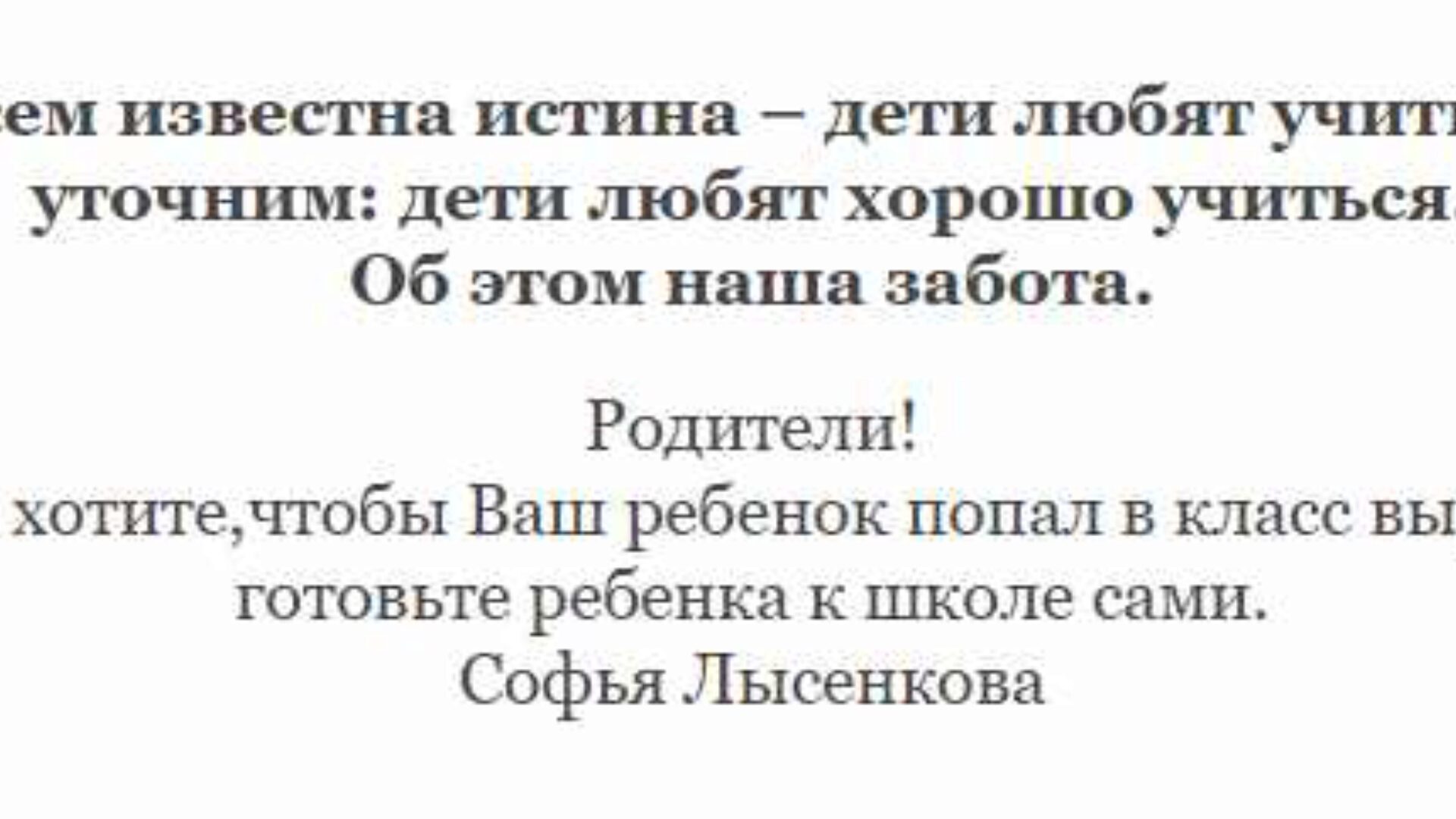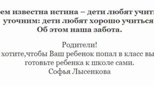 Всем известна истина – дети любят учиться, уточним: дети любят хорошо учиться. Об этом наша забота. Родители! Если вы не хотите,чтобы Ваш ребенок попал в класс выравнивания, готовьте ребенка к школе сами. Софья Лысенкова УНИКАЛЬНЫЙ ФИЛЬМ ПОМОЖЕТ НАЙТИ ПОДХОД К РЕБЕНКУ Шаталов В.Ф. Педагогическое
