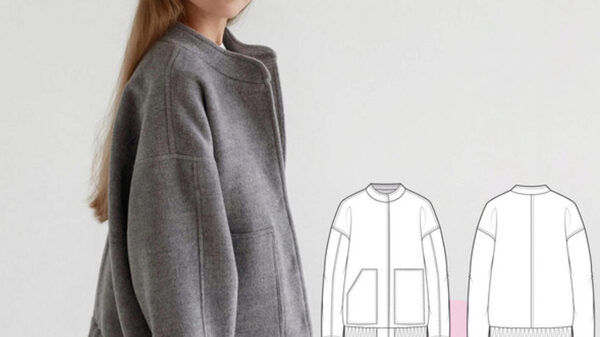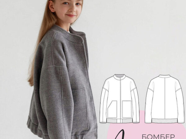 Выкройка бомбера. Куртка-бомбер оверсайз, свободного объёма, прямого силуэта, длиной до линии бедер. Застежка центральная бортовая на кнопки. На деталях переда прорезные карманы с листочкой. Спущенная линия плеч, рукав втачной рубашечный. Горловина круглой формы обработана воротником-стойкой. Низ