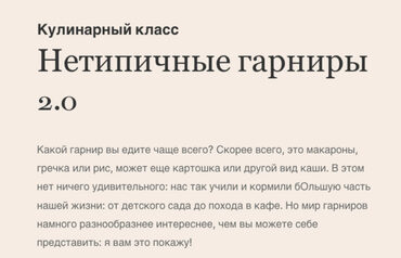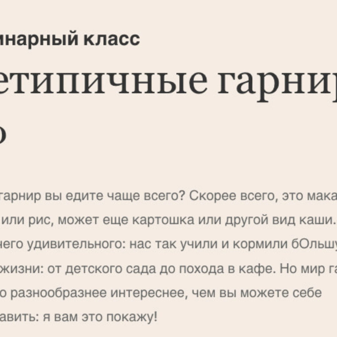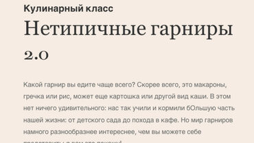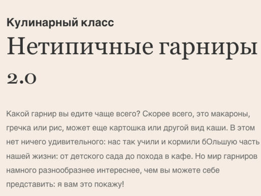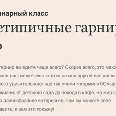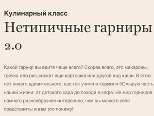 «Счастье есть. Есть гарниры»: За 4 недели на этом курсе вы: научитесь работать со всеми основными крупами (рис, гречка, овсянка, перловка, булгур, пшено); откроете для себя новые техники приготовления и вкусовые сочетания (жареная овсянка с имбирем, пшено в тыкве, маджадра с булгуром); приготовите