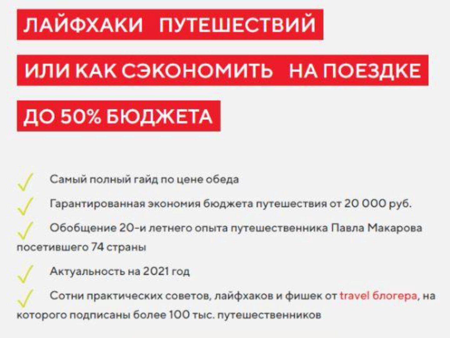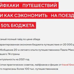 - Сотни практических советов, лайфхаков и фишек от travel блогера, на которого подписаны более 100 тыс. путешественников