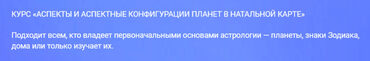 Пройдя этот курс, Вы сможете научиться интерпретировать любые аспекты между планетами натальной карты и замкнутые аспектные конфигурации — как в разрезе астропсихологии, так и в событийном и ролевом разрезах.
