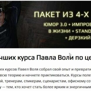 Юмор: Начало 3.0 + Импровизация + Stand up 2.0 (Павел Воля) Курс, с помощью которого вы разовьете заложенное в вас чувство юмора Курс стал результатам многолетнего опыта в юморе Павла Воли. Курс полезен ведущим мероприятий, тренерам, спикерам, сценаристам, любому человеку, кто чувствует, что юмор