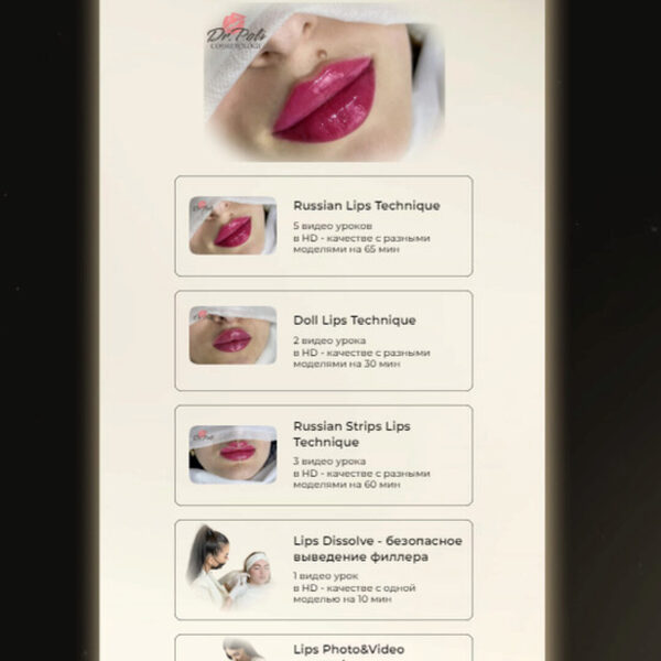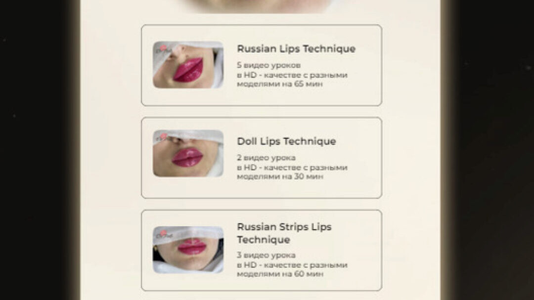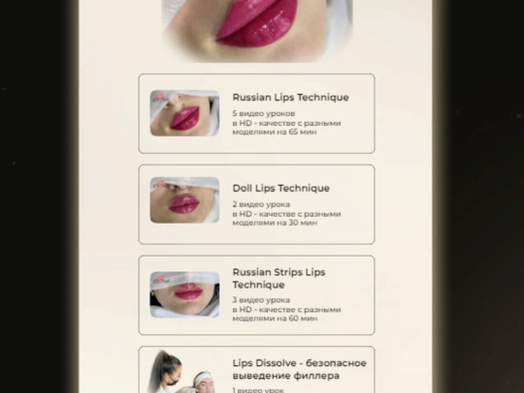 ПРОГРАММА КУРСА КУРС RUSSIAN LIPS (ГУБКИ ПЛОСКИЙ БАНТ) Программа курса Russian lips (губки плоский бант) включает в себя следующую информацию: как сделать сепарацию выворачивания губы в плоскости; как выворачивать губы филлером; хвост русалки, плоские губки и бантик; сочетание нескольких техник для