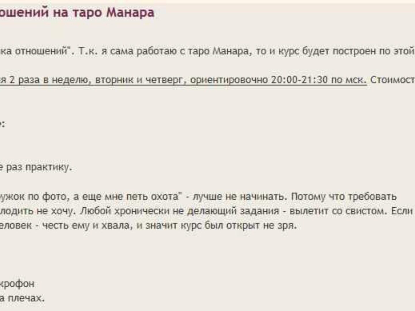 Обучающий курс для продвинутых тарологов по колоде таро Манара Программа курса Блок I Особенности Таро Манары История и структура колоды. Подробно разбираем нюансы и особенности колоды Манара и основы консультирования на отношения Блок II Старшие Арканы Значения Старших Арканов в прямом положении с