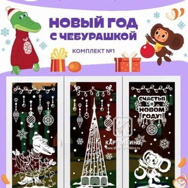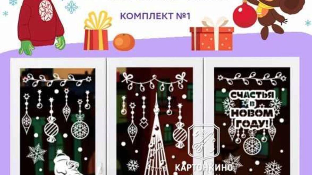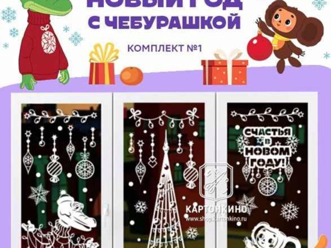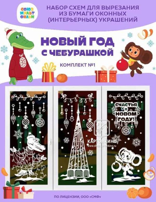 Данный набор шаблонов для вырезания из бумаги поможет изготовить забавные ажурные декорации с любимыми мультперсонажами — Чебурашкой и крокодилом Геной — для украшения окна (или других участков интерьера) к Новому году в детском саду и других детских учреждениях, а также дома.