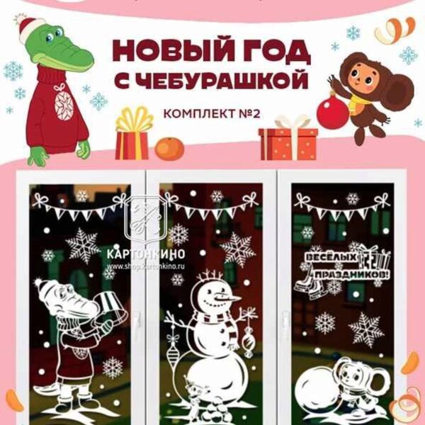 Данный набор шаблонов для вырезания из бумаги поможет изготовить забавные ажурные декорации с любимыми мультперсонажами — Чебурашкой и крокодилом Геной — для украшения окна (или других участков интерьера) к Новому году в детском саду и других детских учреждениях, а также дома.