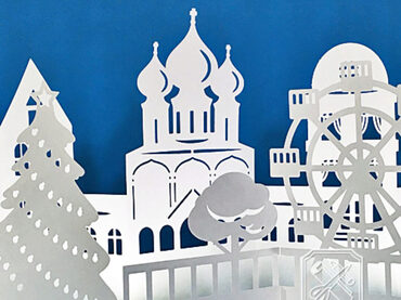 Праздничные городские мотивы составлены из 2-х сложенных гармошкой резных слоёв, между которыми прокладывается светодиодная лента или гирлянда. В результате подсветки резные городские сюжеты буквально «оживают», создавая волшебное ощущение присутствия и вызывая самые приятные и тёплые ассоциации.