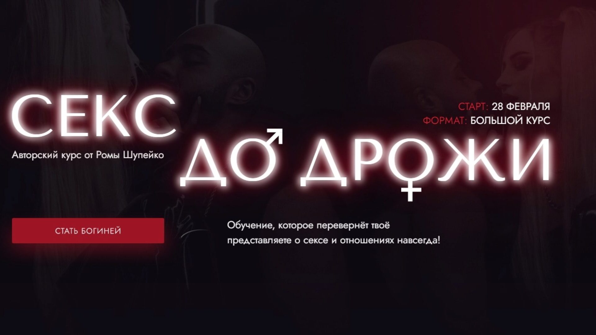 Обучение, которое перевернёт твоё представляете о сексе и отношениях навсегда! ЭТОТ КУРС ДЛЯ ТЕБЯ, ЕСЛИ... Ты хочешь обрести уверенность в себе и поднять самооценку Ты узнаешь все секреты, как стать богиней в жизни и в сексе Секс стал скучным и однообразным Ты научишься незабываемым техникам, что