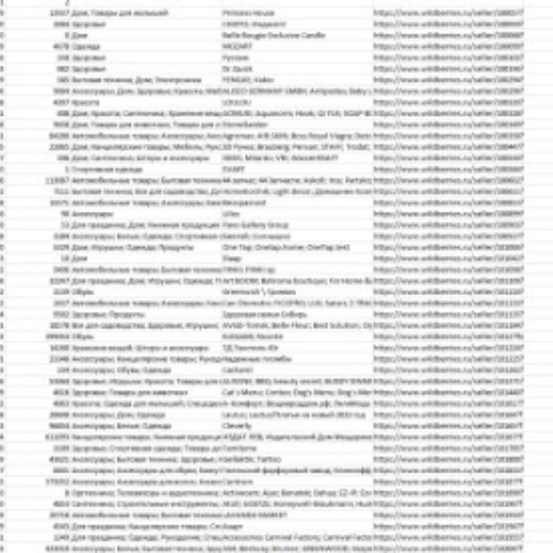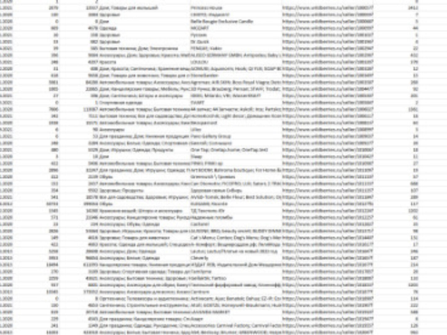 ID продавца, Страница на сайте Wildberries, Наименование организации на Wildberries, Адрес организации на Wildberries, Дата регистрации на Wildberries, Количество отзывов, Проданных товаров, Процент товаров с браком, Разделы товаров, Бренды продавца, Ссылки на бренды продавца, Количество товаров в продаже на дату сбора данных, Средняя цена товаров, Средний показатель скидки товаров, Среднее количество отзывов у товаров, Средний показатель рейтинга товаров, Организация, Статус организации, Дата регистрации, ОГРН, ИНН, Юридический адрес, ФИО руководителя, Телефон, Email, Сайт, Мобильный телефон ИП, совладельцы, основной код ОКВЭД, Среднесписочная численность работников, Выручка, Чистая прибыль (убыток).