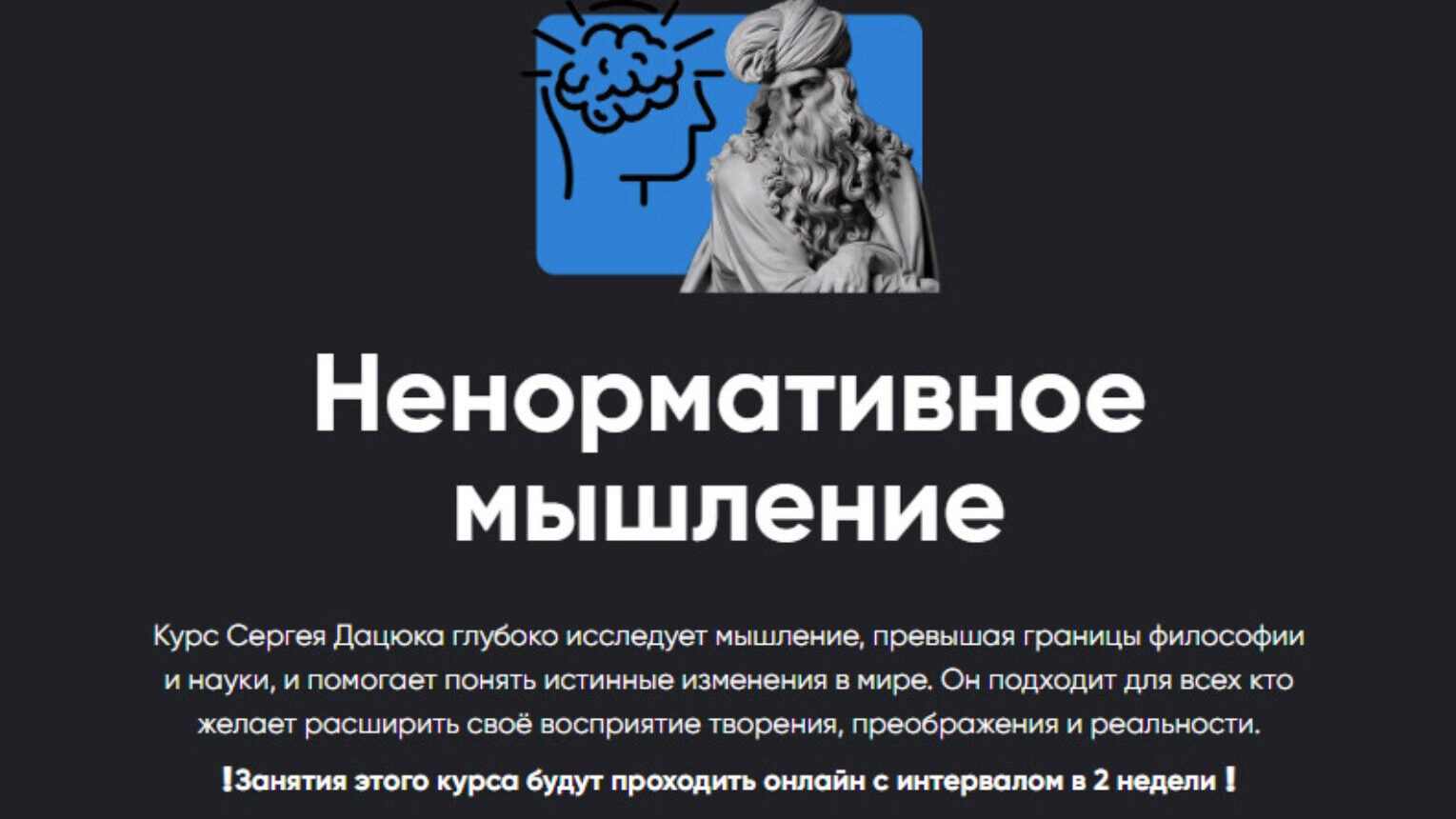 Речь идет о курсе лекций «Ненормативное мышление» философа, теоретика, мыслителя Сергея Аркадьевича Дацюка и создан в ответ на следующие вызовы: