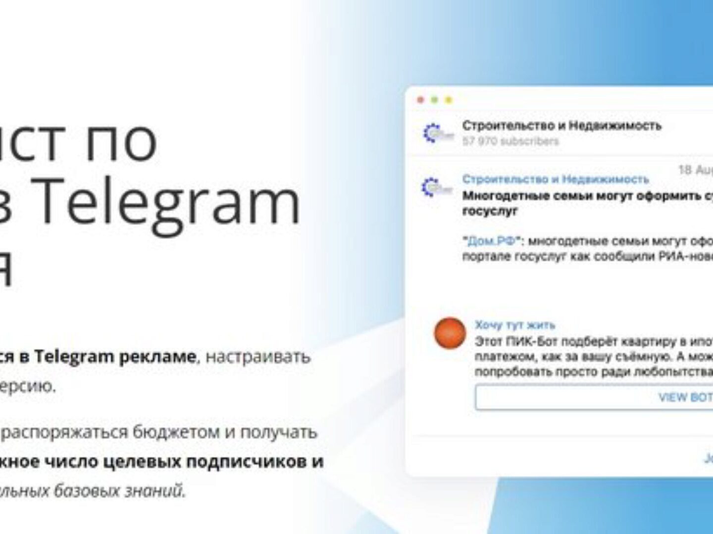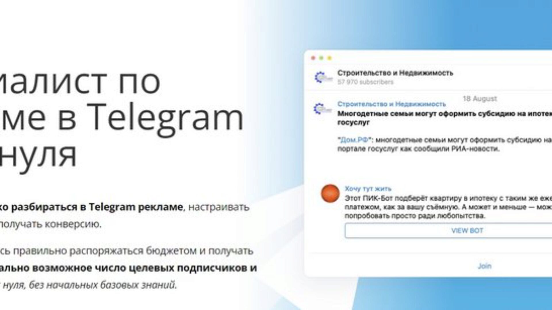 Вы успешно работаете в своей области интернет-рекламы, но хотите расширения профессионального кругозора, карьерного роста и роста в доходах? Таргетируемая реклама в Telegram – смежная область, лёгкая для освоения на базе имеющегося у вас опыта.