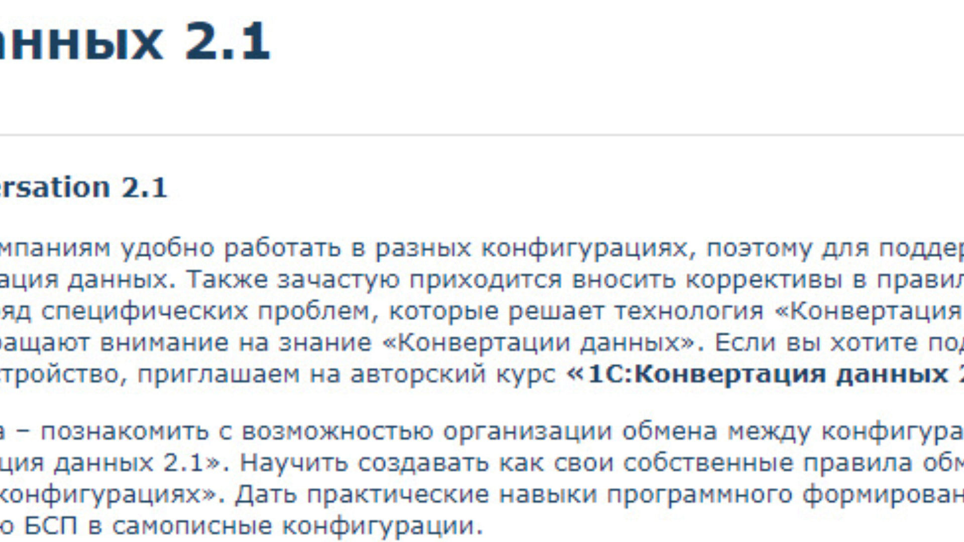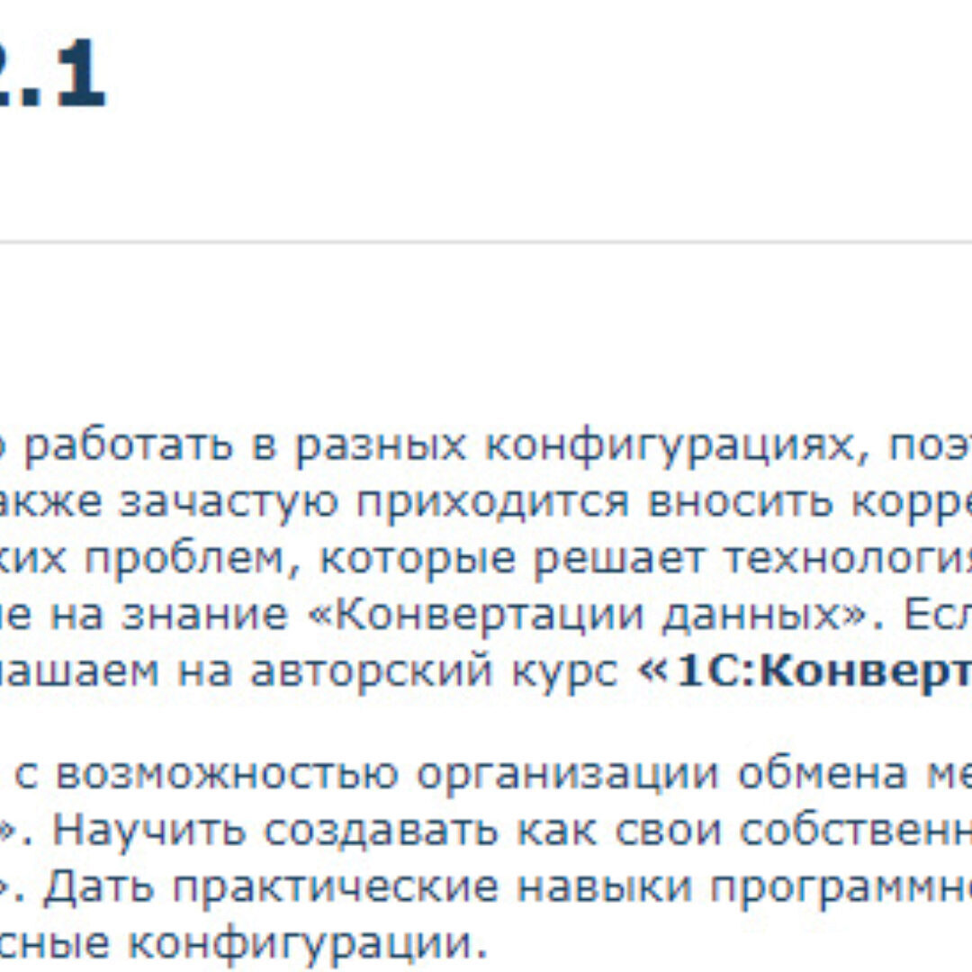 Цель курса – познакомить с возможностью организации обмена между конфигурациями «1С:Предприятие» с помощью технологии «Конвертация данных 2.1». Научить создавать как свои собственные правила обмена, так и редактировать правила обмена в «типовых конфигурациях». Дать практические навыки программного формирования XML-файла выгрузки данных. Рассмотреть интеграцию БСП в самописные конфигурации.